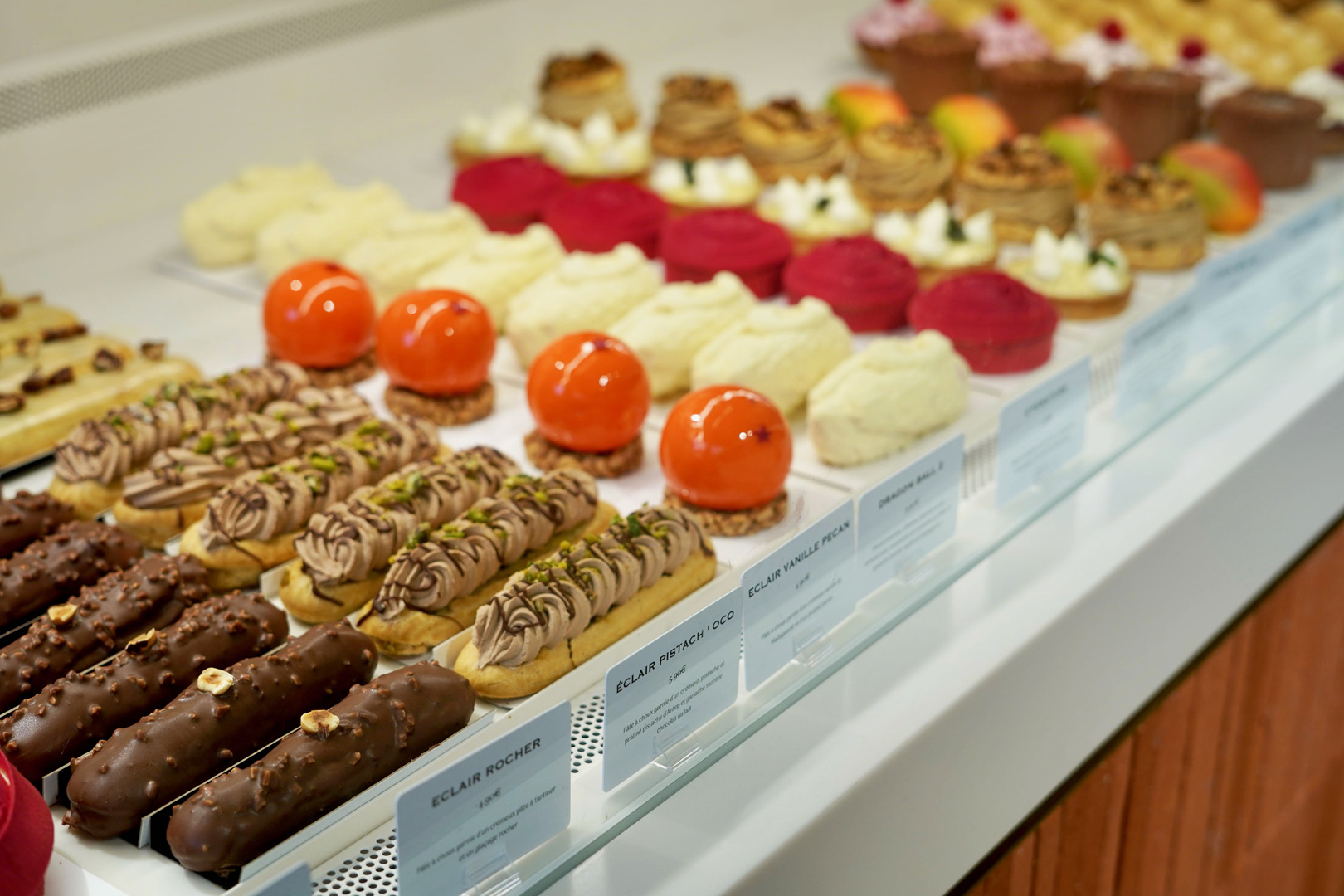 At the heart of the environment are two canalized 6040 pastry display cases, designed to offer elegant presentation, optimal preservation, and a high‑impact visual effect. The RAL 9016 painted sheet metal details emphasize the minimal and luminous character of the project, creating a clean and timeless aesthetic.