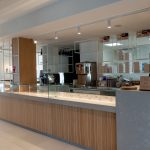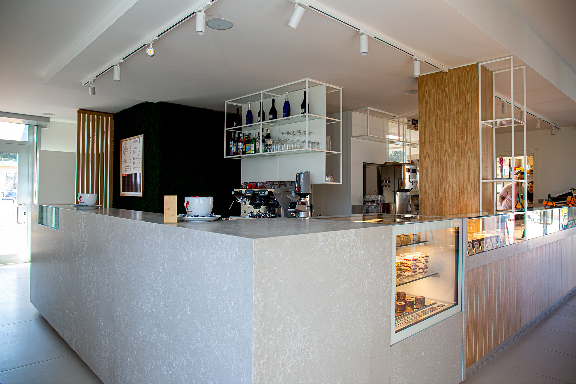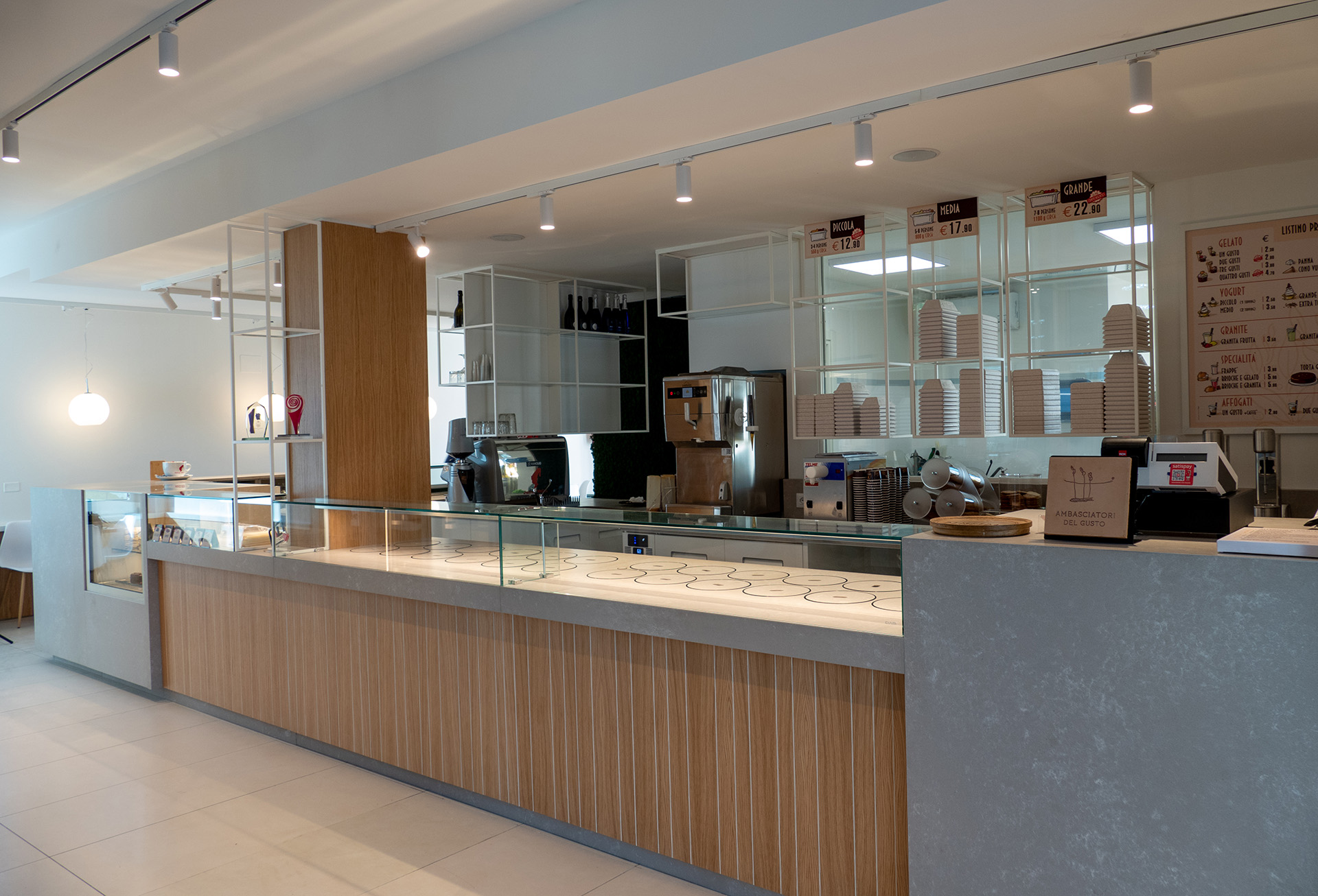 Inoltre, CIAM ha curato la realizzazione di espositori in tubolari verniciati RAL 9010 bianco puro e l’intera pannellatura delle pareti e del bancone, in legno rovere naturale semi fiammato con incisioni verticali verniciate RAL 9010 bianco puro.