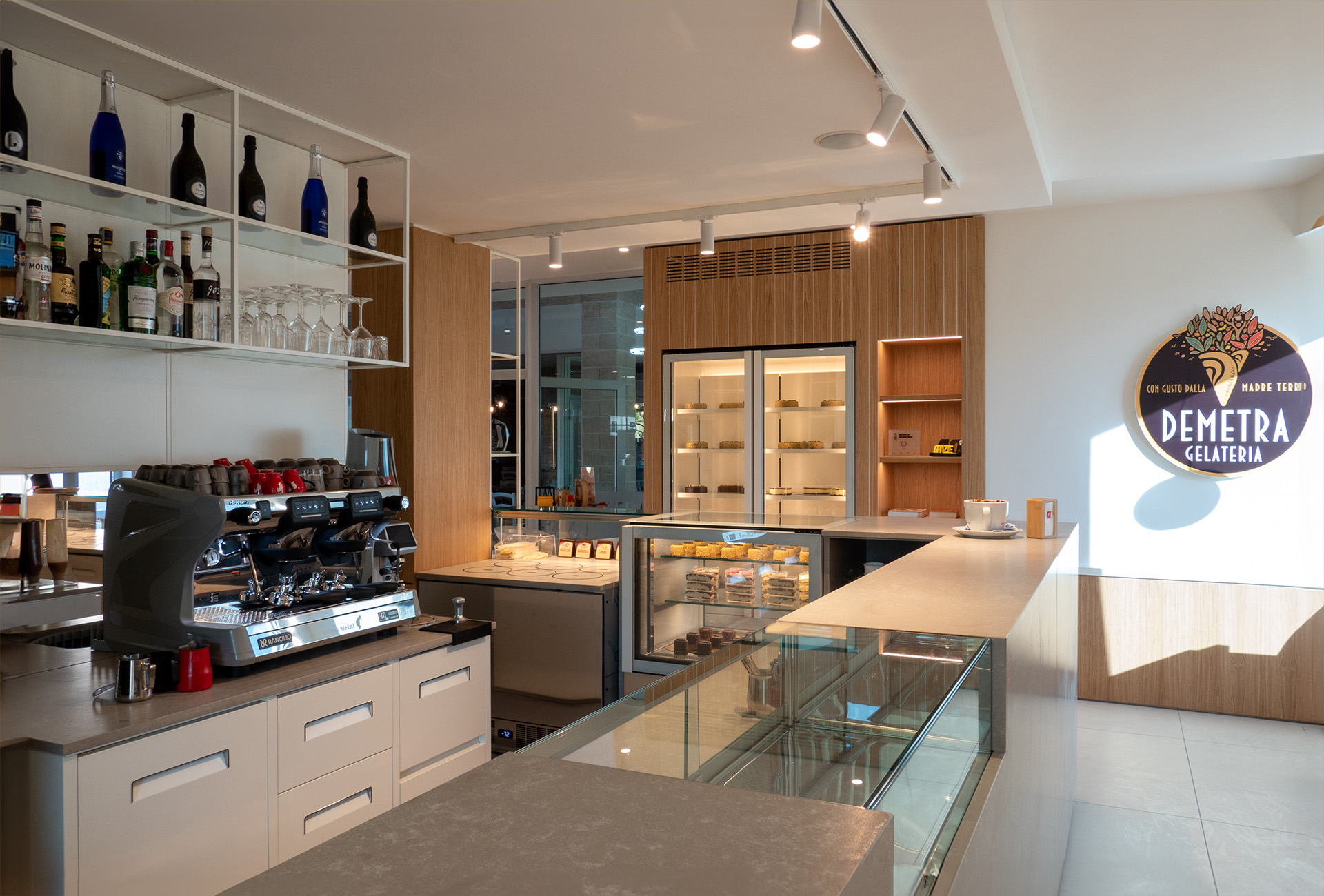 Interamente progettato e arredato da CIAM, il nuovo spazio della Gelateria Demetra di Santa Maria degli Angeli si caratterizzata per un design moderno e funzionale, che trova la sua ispirazione negli elementi e nelle suggestioni della natura. Un ambiente che anche nei materiali – dal legno rovere naturale ai composti di quarzo del Santa Margherita Metropolis, con cui sono stati rivestiti i pozzetti Circle – richiama l’autenticità del concept stesso di gelateria artigianale, in cui a essere protagonisti sono ingredienti esclusivamente naturali. Uno spazio di 130 metri quadrati pensato e organizzato logisticamente da CIAM per rispondere a esigenze di ottimizzazione produttiva e commerciale, innovazione sostenibile, ed estetica. Un progetto all’insegna della tecnologica e del design tailor-made che ha dotato la gelateria dei seguenti prodotti CIAM: