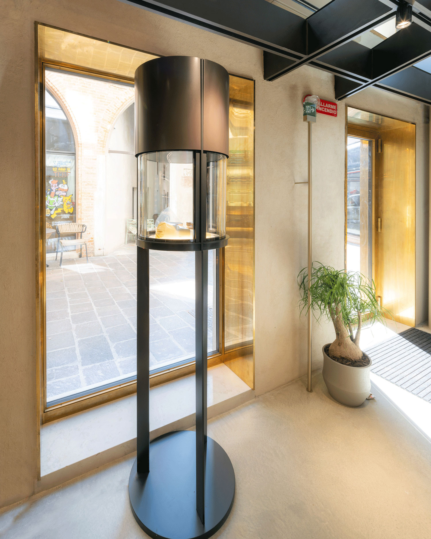 - vetrina Flat dotata di teca con vetro curvo a temperatura positiva; profili e ferramente verniciati in RAL 1036; piano di lavoro, piano perimetrale e vassoi espositivi in Laminam Calacatta oro venato lucido; rivestimento in noce canaletto e ottone naturale satinato invecchiato liquido; cella refrigerata di riserva sottostante con schienale in vetro