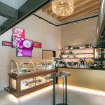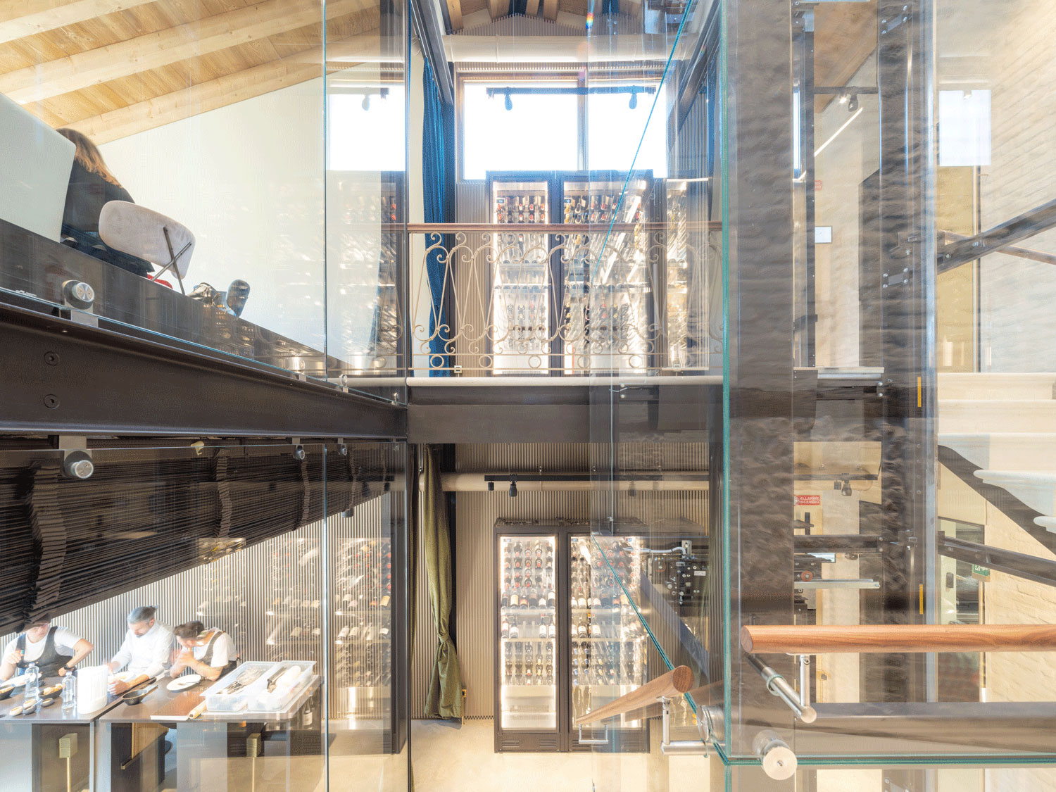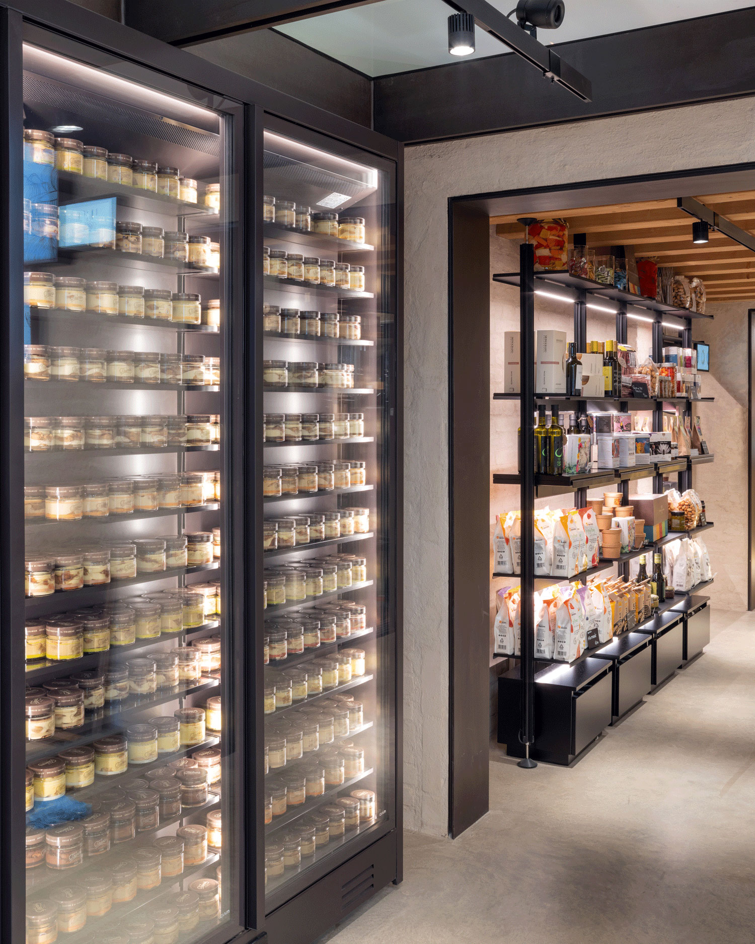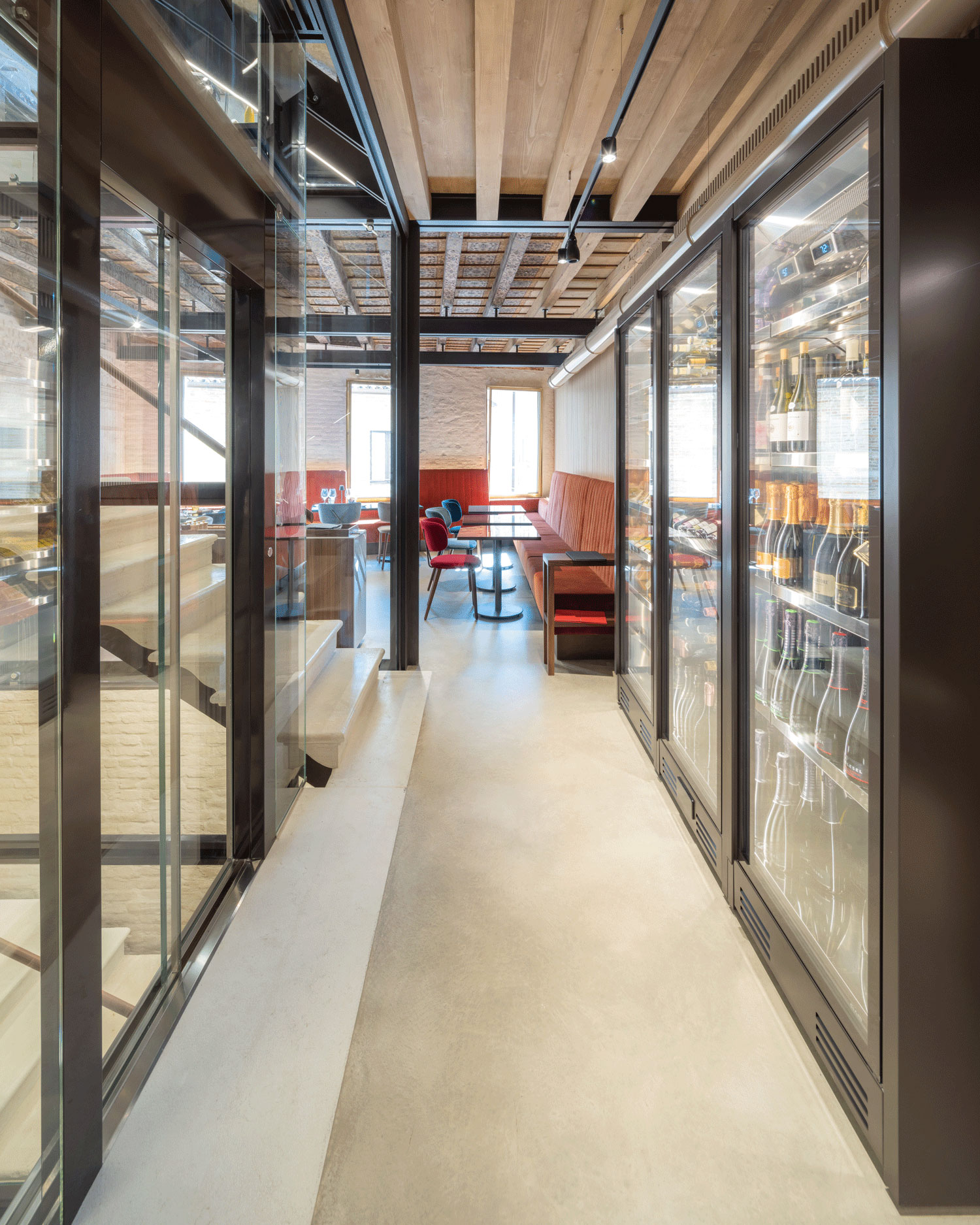 - Quattro vetrine verticali Murozero (collocate al piano terra) a temperatura negativa e positiva dotate di porte Zero verniciate in RAL 8019; pannellatura esterna in Betacryl coffee brown; fianchi e schienali specchiati; 3 mensole standard in vetro