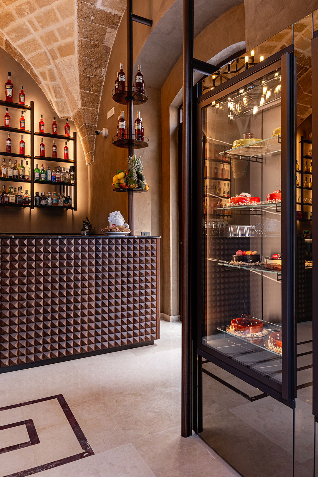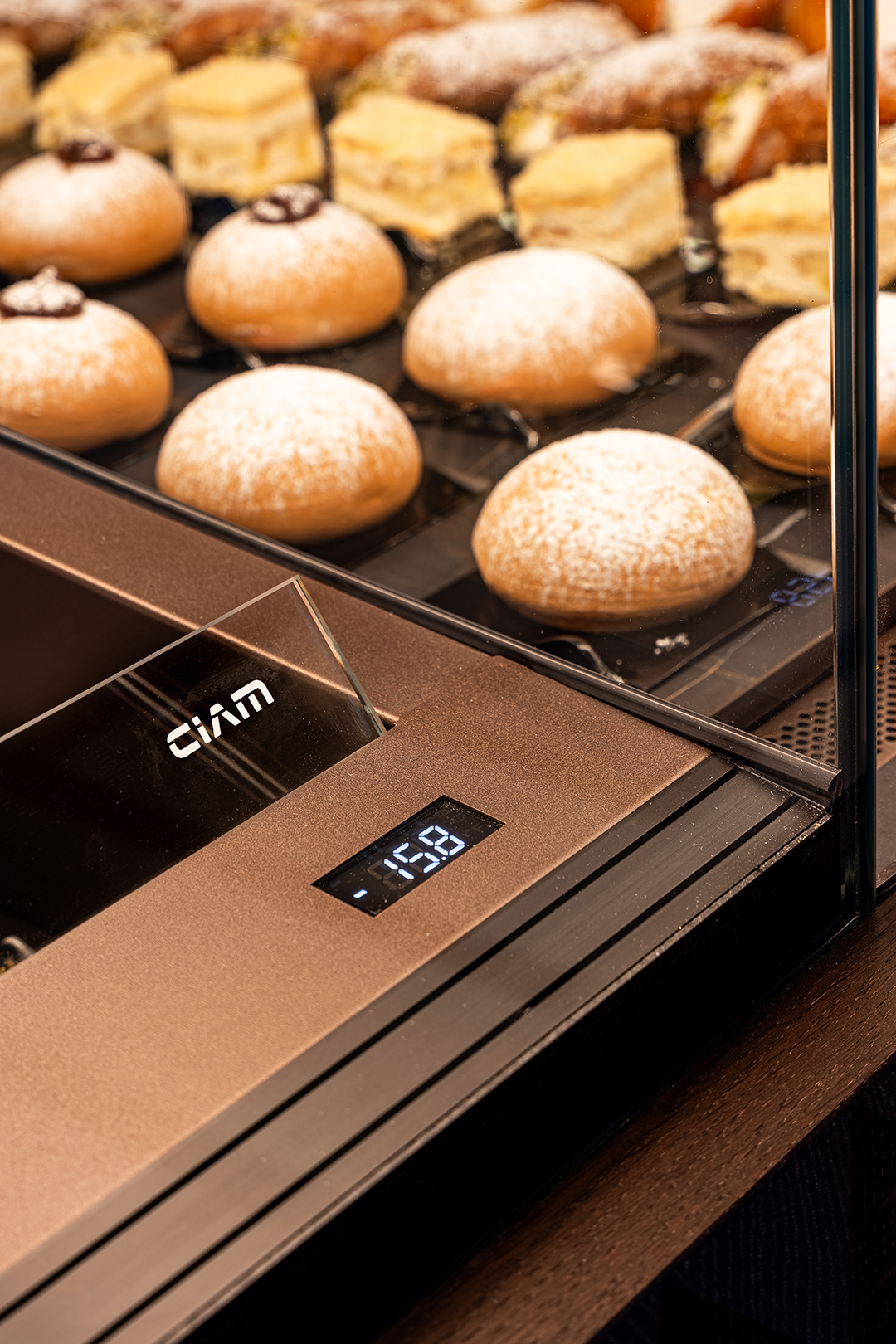 - Vetrine 6040 G1: Tre vetrine pasticceria (una con piastra calda) e una gelateria, complete di vassoi espositivi e piano perimetrale in lamiera verniciata Rostiges Eisen, con piano di lavoro in marmo Sahara Noir opaco.