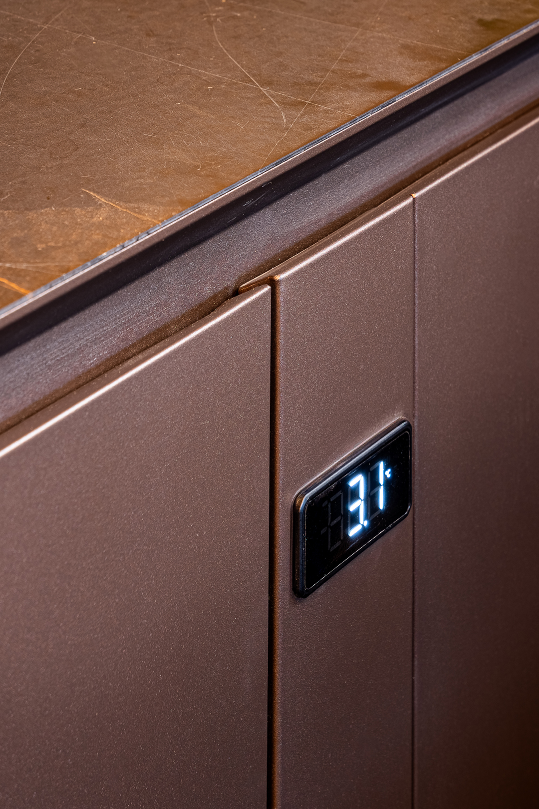 - Murali Murozero: Il locale dispone di tre murali Murozero, due a temperatura negativa e uno a temperatura positiva. Questi murali, installati all’interno delle pareti del locale e rivestiti internamente in gres Inalco, presentano porte con finiture in Rostiges Eisen e interni verniciati a polveri RAL 9005 nero intenso. La loro tecnologia avanzata e il design elegante contribuiscono a creare un ambiente sofisticato e funzionale.