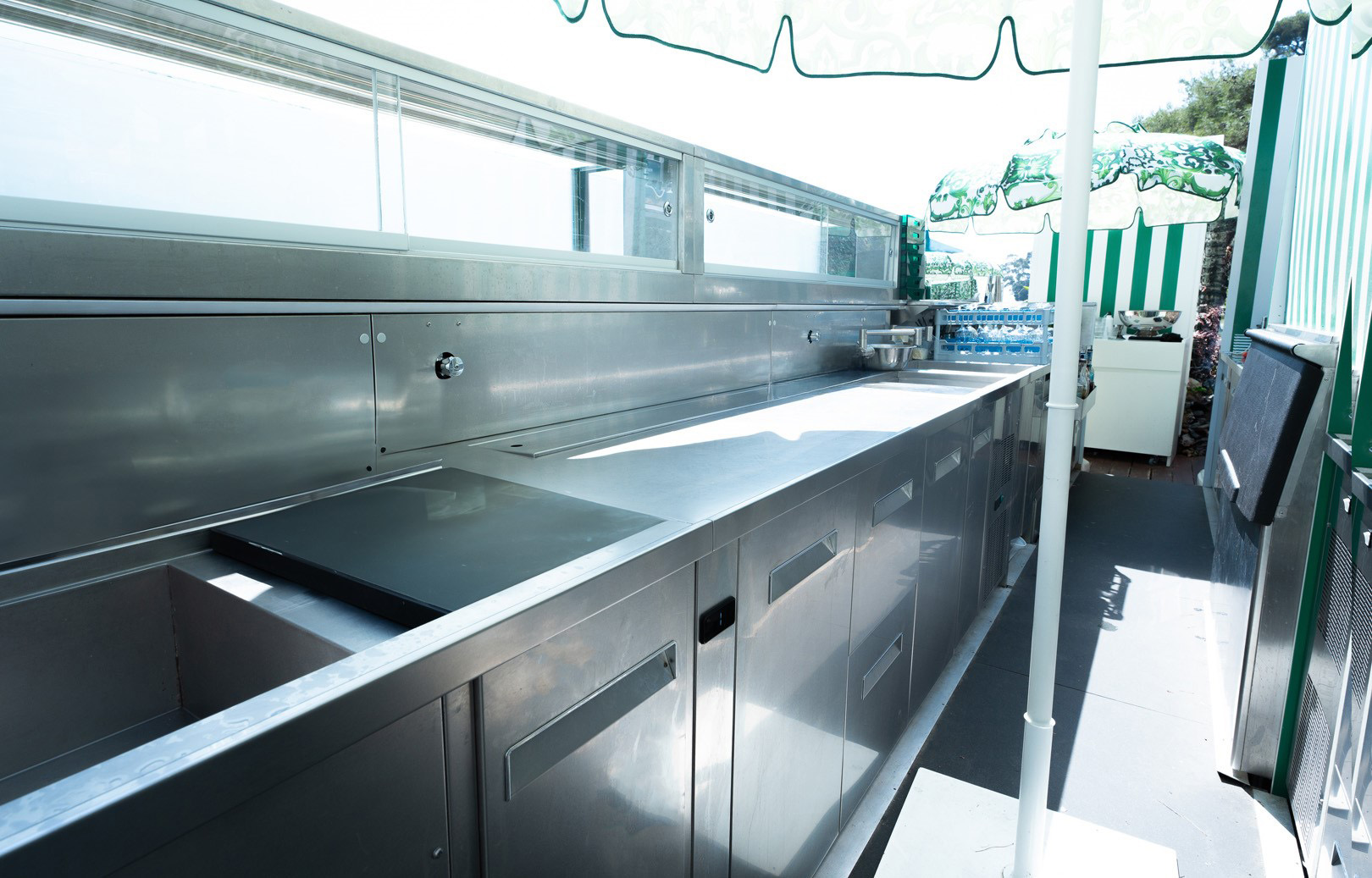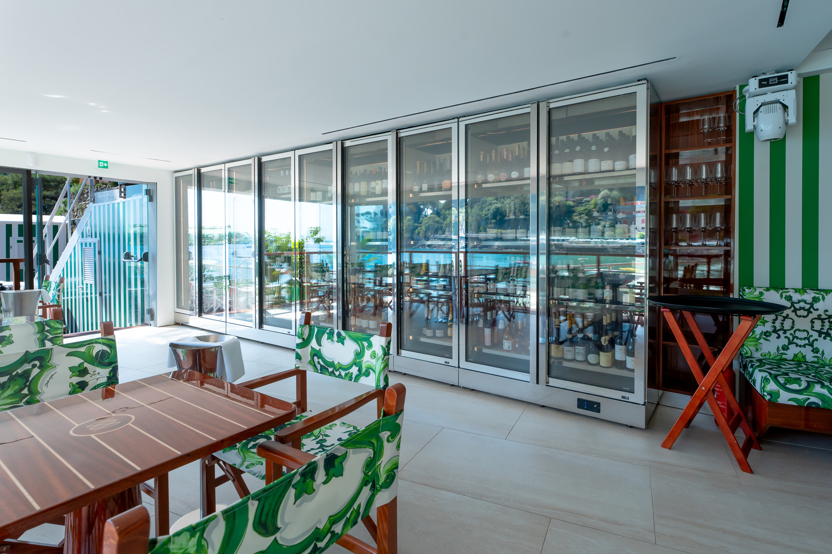 - Linea banchi refrigerati e neutri Compact, progettata per l’area crudi esterna vista mare e per la zona dinner-disco interna. Caratterizzati da un design essenziale con maniglia a gola e finitura in acciaio inox orbitale, questi banchi si integrano perfettamente con l’estetica raffinata dell’ambiente, garantendo funzionalità e coerenza stilistica.
